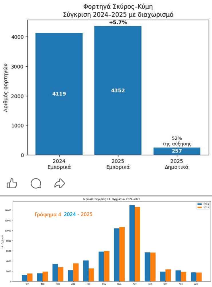 Η επιβατική κίνηση αυξήθηκε κατά 0,92%, τα Ι.Χ. παρέμειναν ουσιαστικά αμετάβλητα (−0,21%), η αύξηση των φορτηγών κατά 11,9% οφείλεται σε σημαντικό βαθμό (6,2%) στη μεταφορά απορριμμάτων του Δήμου Σκύρου στον ΣΜΑ Κύμης, (257 οχήματα κατά το 2025) αλλα και επιλογών που αναλύονται παρακάτω.