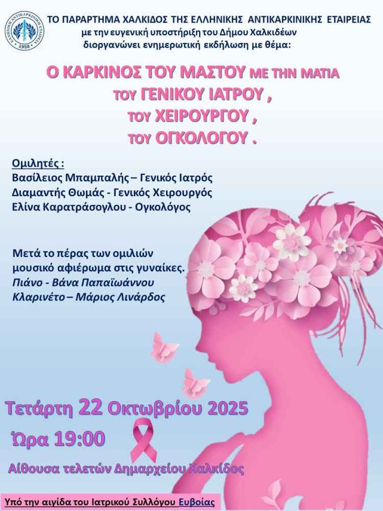 Παράλληλα, ο Δήμος στηρίζει την εκδήλωση της Ελληνικής Αντικαρκινικής Εταιρείας – Παραρτήματος Χαλκίδας, η οποία θα πραγματοποιηθεί την Τετάρτη 22 Οκτωβρίου στην Αίθουσα Τελετών του Δημαρχείου, με ενημερωτικές ομιλίες ιατρών και στόχο την ενημέρωση και ευαισθητοποίηση του κοινού.