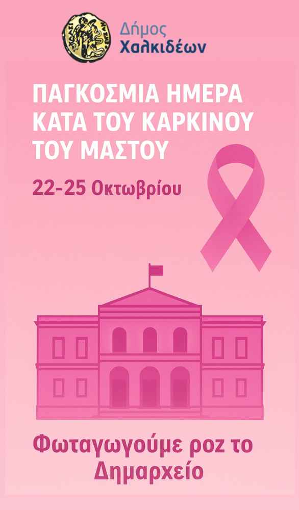 Ο Δήμος Χαλκιδέων συμμετέχει και φέτος ενεργά στην Παγκόσμια Ημέρα κατά του Καρκίνου του Μαστού, που τιμάται στις 25 Οκτωβρίου, αφιερωμένη σε όλες τις γυναίκες που έδωσαν ή δίνουν τη μάχη με τη νόσο — στις νικήτριες, στις μαχήτριες και σε όσες δεν τα κατάφεραν.
