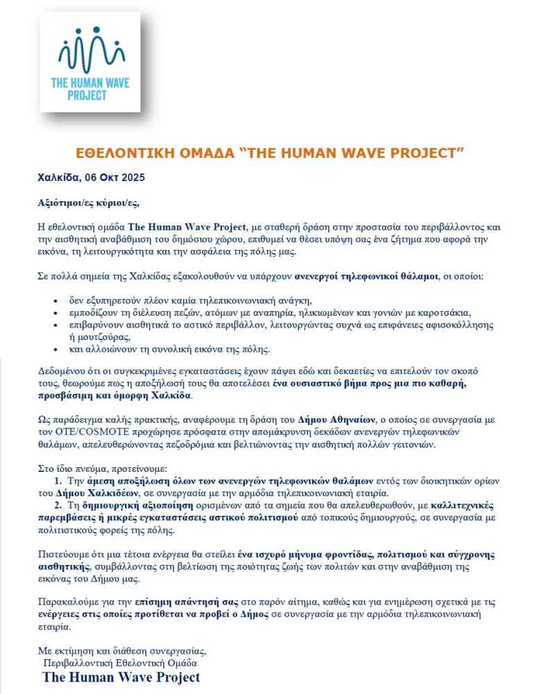 Ένα ακόμη βήμα προς μια πιο καθαρή και καλαίσθητη πόλη κάνει η ομάδα The Human Wave Project, η οποία υπέβαλε επίσημο αίτημα προς τον Δήμο Χαλκιδέων και την COSMOTE για την αποξήλωση των ανενεργών τηλεφωνικών θαλάμων που παραμένουν εγκαταλελειμμένοι και ασχημαίνουν το αστικό τοπίο.