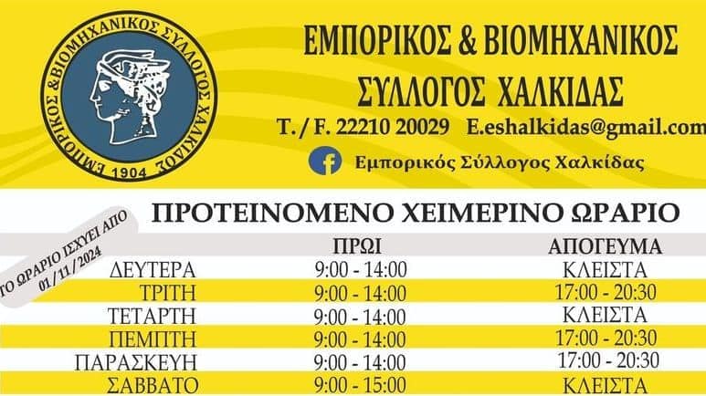 Ο Εμπορικός Σύλλογος Χαλκίδας κοινοποίησε το Προτεινόμενο Χειμερινό Ωράριο Καταστημάτων, το οποίο μπαίνει σε ισχύ από την Παρασκευή 1 Νοεμβρίου 2024 και ισχύει όπως περιγράφεται παρακάτω: