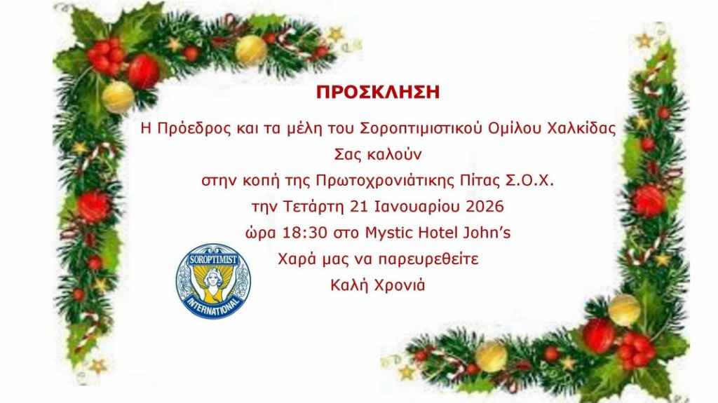 Με μια απογευματινή συνάντηση που σηματοδοτεί την έναρξη των δράσεων της νέας χρονιάς, ο Σοροπτιμιστικός Όμιλος Χαλκίδας προγραμματίζει την καθιερωμένη κοπή της βασιλόπιτας.