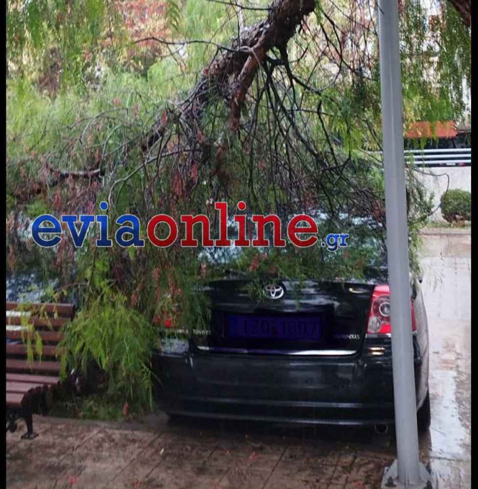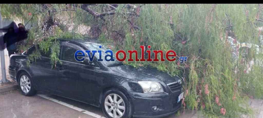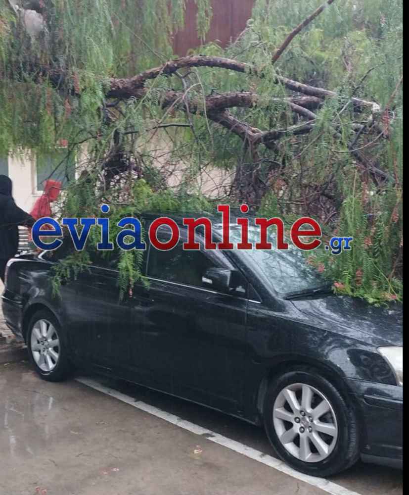 Ένα μεγάλο κομμάτι από δέντρο έπεσε το μεσημέρι της Τετάρτης 5 Νοεμβρίου στη Χαλκίδα, εξαιτίας της κακοκαιρίας που έπληξε την περιοχή, πάνω σε σταθμευμένο αυτοκίνητο.