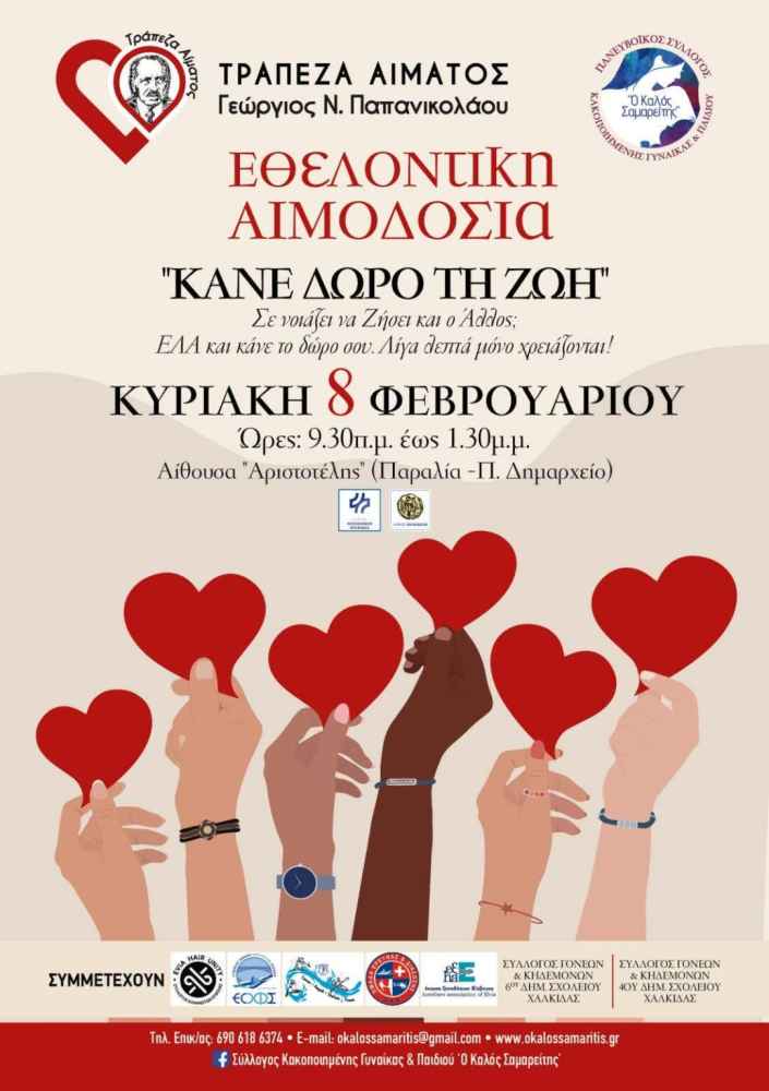 Η αιμοδοσία θα πραγματοποιηθεί την Κυριακή 8 Φεβρουαρίου, με πρωτοβουλία του Πανευβοϊκού Συλλόγου Κακοποιημένης Γυναίκας και Παιδιού «Ο Καλός Σαμαρείτης», στο πλαίσιο των κοινωνικών παρεμβάσεων που αναπτύσσονται στην περιοχή. Όπως επισημαίνεται από τους συμμετέχοντες, η διαδικασία είναι απλή και σύντομη, ωστόσο η συνεισφορά κάθε εθελοντή μπορεί να αποδειχθεί καθοριστική για ανθρώπους που βρίσκονται σε ανάγκη.