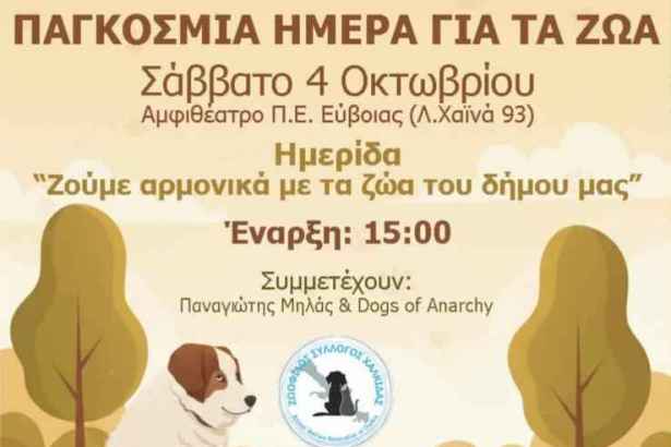 Σήμερα, Σάββατο 4 Οκτωβρίου, με αφορμή την Παγκόσμια Ημέρα για τα Ζώα, πραγματοποιείται στο Αμφιθέατρο της Περιφερειακής Ενότητας Εύβοιας (Λ. Χαινά 93) η ημερίδα με τίτλο «Ζούμε αρμονικά με τα ζώα του δήμου μας».