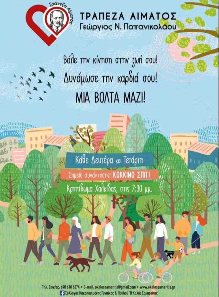 Κάθε Δευτέρα και Τετάρτη, οι κάτοικοι της Χαλκίδας έχουν την ευκαιρία να συνδυάσουν άσκηση, κοινωνική επαφή και προσφορά μέσα από τη δράση «Μια βόλτα μαζί», που οργανώνεται από την Τράπεζα Αίματος «Γεώργιος Ν. Παπανικολάου». Οι συμμετέχοντες δίνουν ραντεβού στο «Κόκκινο Σπίτι» στις 7:30 μ.μ. για έναν περίπατο δίπλα στη θάλασσα, που ενισχύει την καρδιακή υγεία και προσφέρει στιγμές ευεξίας.