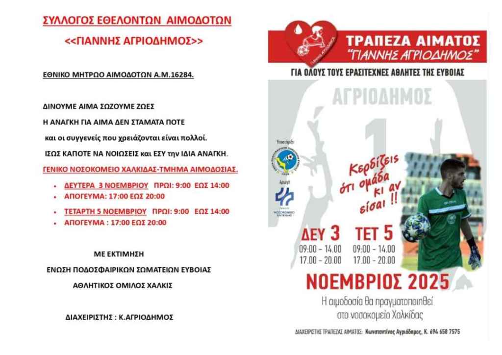 Νέα δράση προσφοράς και αλληλεγγύης διοργανώνει η Τράπεζα Αίματος «Γιάννης Αγριόδημος», τη Δευτέρα 3 και Τετάρτη 5 Νοεμβρίου, στο Γενικό Νοσοκομείο Χαλκίδας.