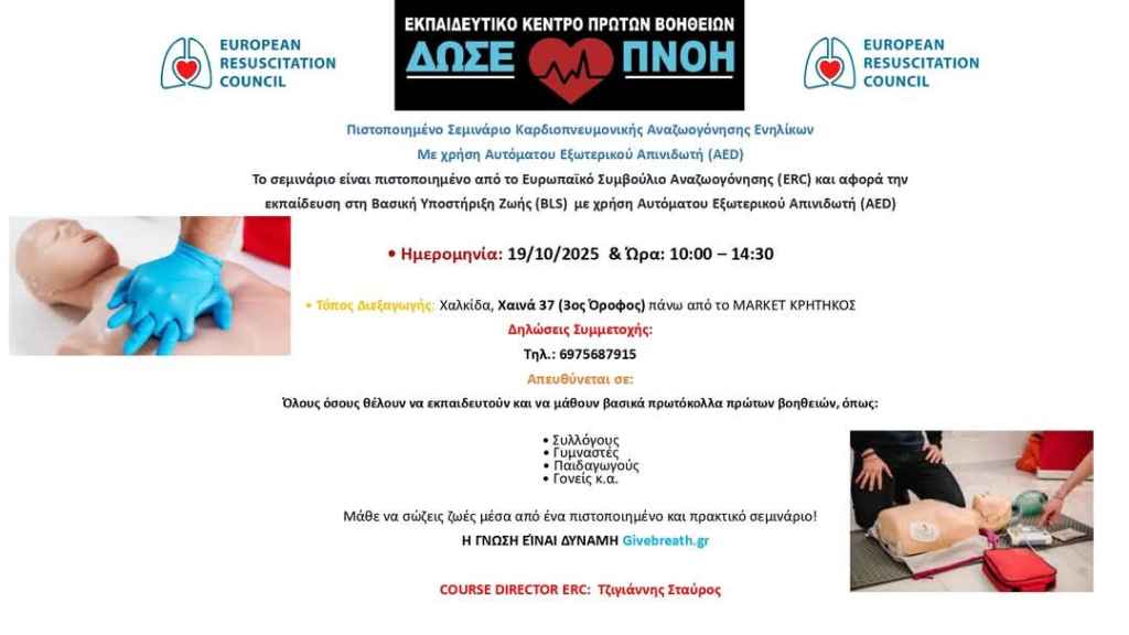 >>> Χαλκίδα: Πιστοποιημένο σεμινάριο Καρδιοπνευμονικής Αναζωογόνησης – Μάθε να σώζεις ζωές με τον μοναδικό πιστοποιημένο σε Εύβοια και Στερεά Ελλάδα από το Ευρωπαϊκό Συμβούλιο Αναζωογόνησης Σταύρο Τζιγιάννη