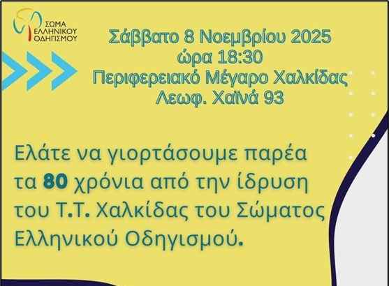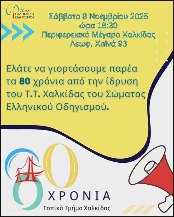 Το Τοπικό Τμήμα Χαλκίδας του Σώματος Ελληνικού Οδηγισμού γιορτάζει φέτος τα 80 χρόνια από την ίδρυσή του και διοργανώνει επετειακή εκδήλωση το Σάββατο 8 Νοεμβρίου 2025, στις 18:30, στο Περιφερειακό Μέγαρο Χαλκίδας (Λεωφ. Χαϊνά 93).