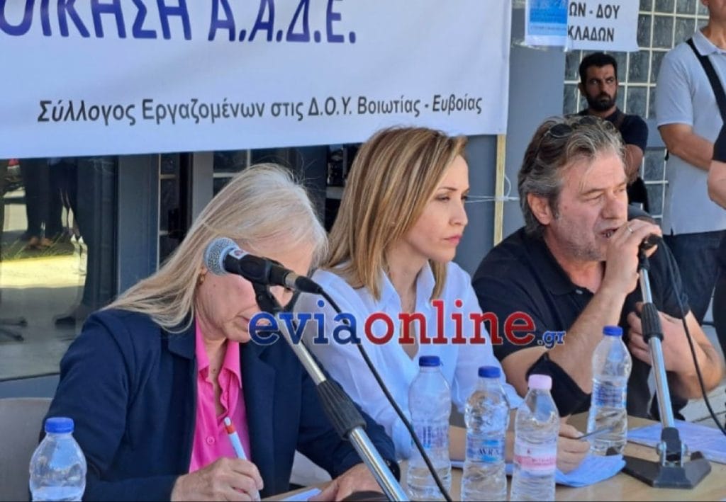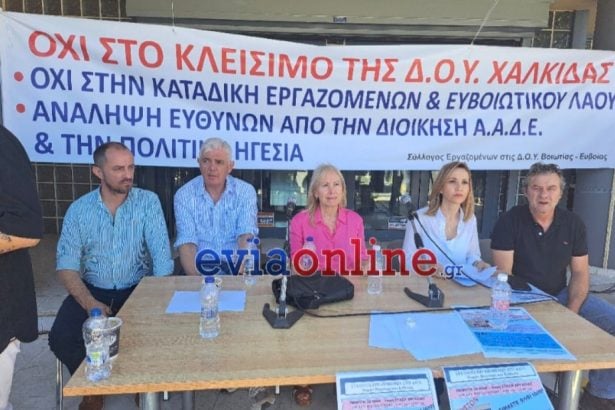 Παρουσία πολλών εκπροσώπων φορέων που διαμαρτύρονται για το υποβιβασμό – μεταφορά αρμοδιοτήτων της Δ.Ο.Υ. Χαλκίδας σε κεντρικές Υπηρεσίες της Αττικής είναι σε εξέλιξη η συνέντευξη τύπου των εργαζομένων. Με απόφαση του ΔΣ του Συλλόγου εργαζομένων στις Δ.Ο.Υ. νομών Βοιωτίας και Εύβοιας έχει κυρηχθεί τρίωρη στάση εργασίας σήμερα.