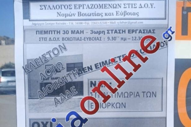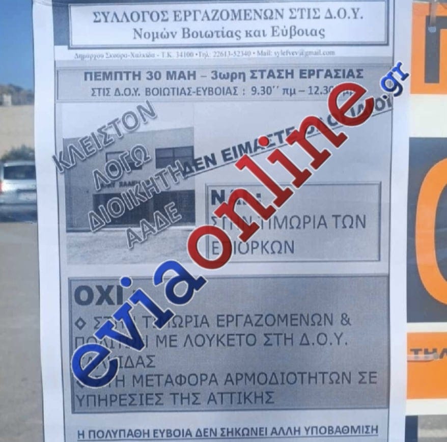 Σε τρίωρη στάση εργασίας προχωρούν σήμερα Πέμπτη 30/5 οι εργαζόμενοι στη ΔΟΥ Χαλκίδας ύστερα από απόφαση του ΔΣ του Συλλόγου εργαζομένων στις Δ.Ο.Υ. νομών Βοιωτίας και Εύβοιας, μετά τις εξαγγελίες της Διοίκησης της ΑΑΔΕ για υποβιβασμό – μεταφορά αρμοδιοτήτων της Δ.Ο.Υ. Χαλκίδας σε κεντρικές Υπηρεσίες της Αττικής.