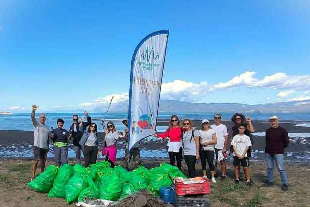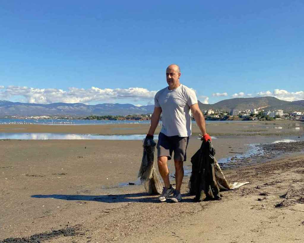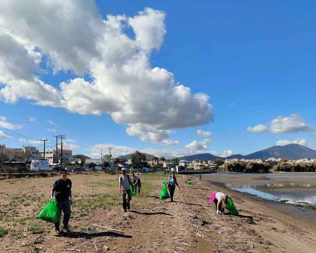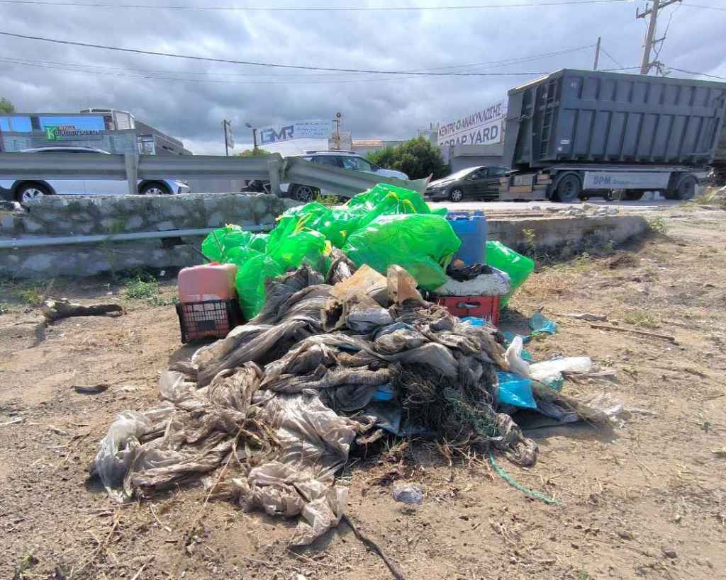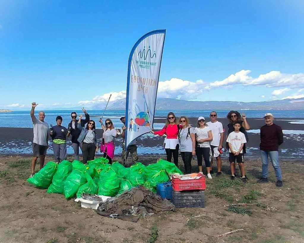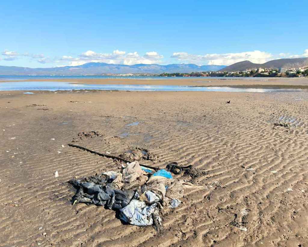 Δεκαέξι εθελοντές, ανάμεσά τους και ο μικρός Αχιλλέας, ο νεότερος της ομάδας αλλά παράδειγμα για όλους, συγκέντρωσαν 3.500 λίτρα απορριμμάτων, απομακρύνοντας πλαστικά, σεντόνια και θαμμένα σκουπίδια που μαρτυρούν τις πληγές της παραλίας από τα βαριά μηχανήματα.