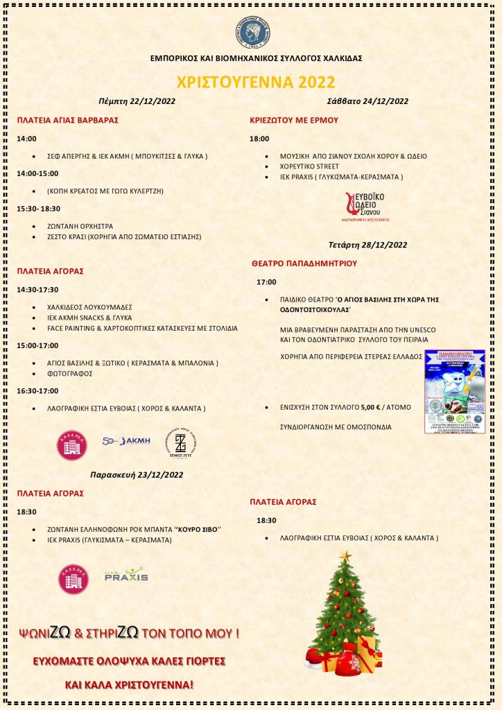 Μετά το στόλισμα των χριστουγεννιάτικων δέντρων στην Πλατεία Αγοράς και στην Αβάντων, στο ύψος του Εμπορικού Κέντρου, ο Εμπορικός και Βιομηχανικός Σύλλογος Χαλκίδας υπό την αιγίδα του Δήμου Χαλκιδέων και τη Δημοτική Ανώνυμη Επιχείρηση Εκμετάλλευσης Περιουσίας Χαλκίδας (Δ.Α.Ε..ΠΕ.Χ.), συνεχίζει το εορταστικό του πρόγραμμα γεμάτο ψυχαγωγικές δράσεις,