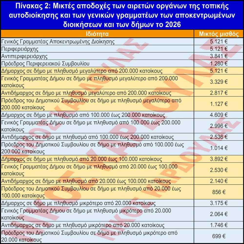 Λαμβάνοντας υπόψη επίσημα στοιχεία από τη Βουλή, από ΦΕΚ και από δημοσιεύσεις στο διαδίκτυο, συντάχθηκαν οι δύο παρακάτω πίνακες, όπου απεικονίζονται στον πίνακα 1 οι μικτές αποδοχές των κρατικών αξιωματούχων και στον πίνακα 2 οι μικτές αποδοχές των αιρετών οργάνων της Τοπικής Αυτοδιοίκησης και των Γενικών Γραμματέων των Αποκεντρωμένων Διοικήσεων και των Δήμων, για το έτος 2026.