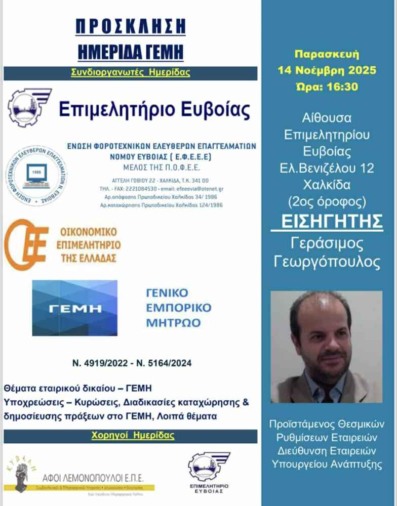 #ΓΕΜΗΔήμος Χαλκιδέωνενημερωτική εκδήλωσηΕπιμελητήριο Εύβοιαςεταιρικό δίκαιοΕύβοιαΕΦΕΕΕΟικονομικό Επιμελητήριο ΕλλάδαςΧαλκίδα