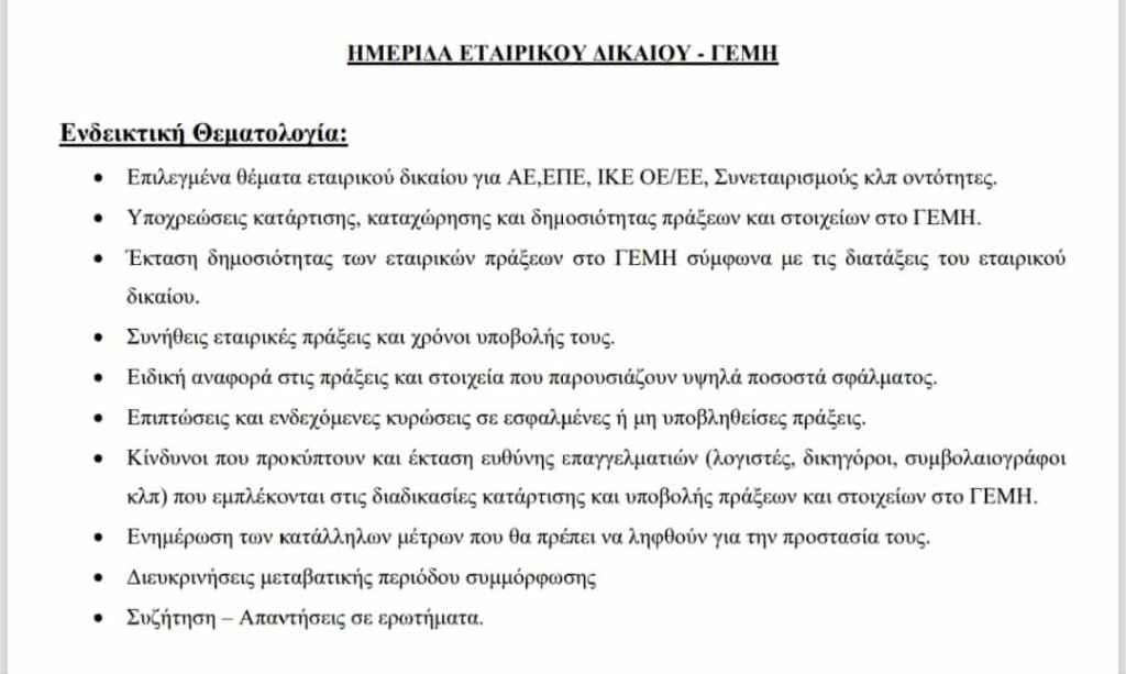 «Εταιρικό Δίκαιο – ΓΕΜΗ: Υποχρεώσεις, Κυρώσεις, Διαδικασίες Καταχώρησης & Δημοσίευσης Πράξεων στο ΓΕΜΗ, Λοιπά Θέματα».