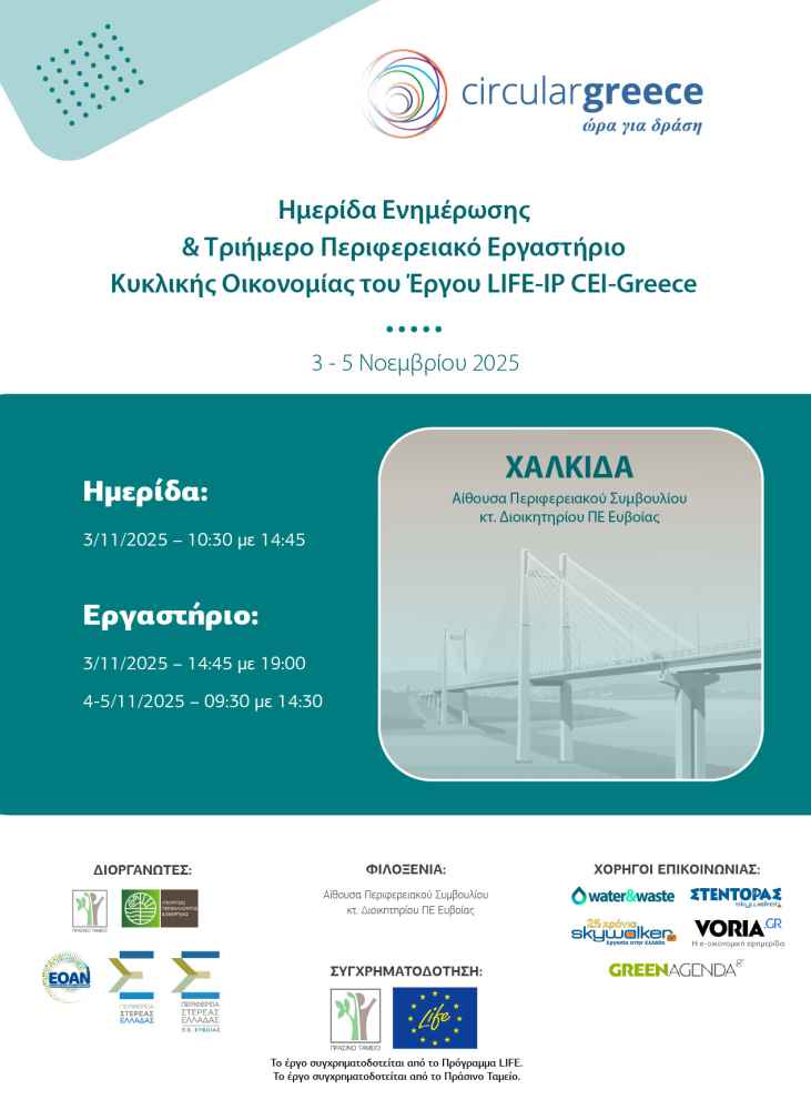 Η ημερίδα θα πραγματοποιηθεί τη Δευτέρα 3 Νοεμβρίου (10:30-14:45) στην Αίθουσα Περιφερειακού Συμβουλίου του Διοικητηρίου Π.Ε. Ευβοίας (Λ. Χαϊνά 93, Χαλκίδα) και θα είναι ανοιχτή στο κοινό. Θα παρουσιαστεί το έργο LIFE-IP CEI-Greece, καλές πρακτικές και καινοτόμες εφαρμογές κυκλικής οικονομίας που μπορούν να υλοποιηθούν στη Στερεά Ελλάδα.