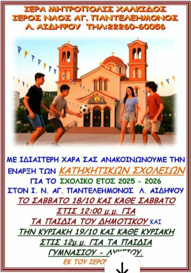 Με ιδιαίτερη χαρά, η Ιερά Μητρόπολη Χαλκίδος και ο Ιερός Ναός Αγίου Παντελεήμονος Λουτρών Αιδηψού ανακοινώνουν την έναρξη των Κατηχητικών Σχολείων για το σχολικό έτος 2025–2026.