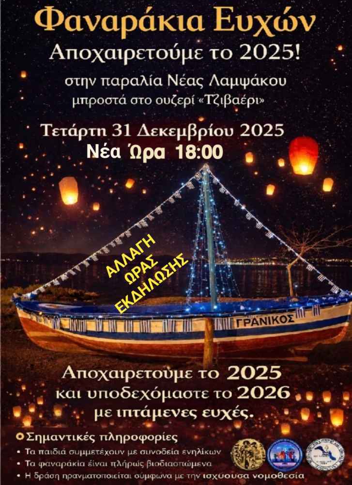 Αλλαγή στην ώρα διεξαγωγής της εκδήλωσης με τα Φαναράκια Ευβοίας ανακοινώθηκε για την παραμονή της Πρωτοχρονιάς, Τετάρτη 31 Δεκεμβρίου 2025, προκειμένου να δοθεί η δυνατότητα σε περισσότερους πιστούς και κατοίκους να συμμετάσχουν τόσο στη θρησκευτική ακολουθία όσο και στη γιορτινή δράση. στη Ν. Λάμψακο. Στον Ιερό Ναό Αγίου Τρύφωνα θα τελεστεί η ακολουθία του Μεγάλου Εσπερινού στις 17:00. όπου ο ιερέας π. Πέτρος Βλάχος θα ευλογήσει τις βασιλόπιτες.