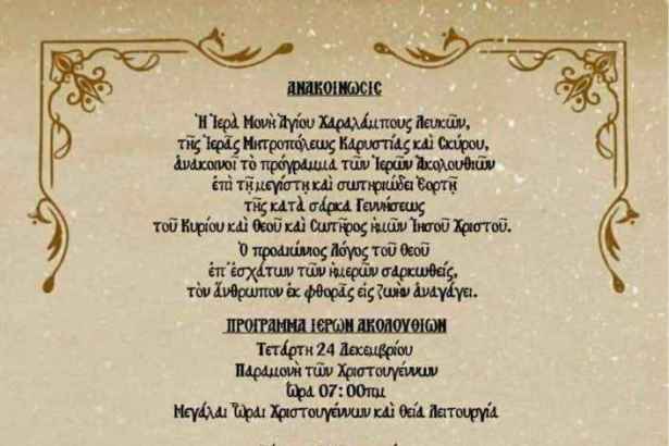 Η Ιερά Μονή Αγίου Χαραλάμπους Λευκών, στην Ιερά Μητρόπολη Καρυστίας και Σκύρου, ανακοίνωσε το πρόγραμμα των Χριστουγεννιάτικων Ιερών Ακολουθιών και προσκαλεί τους πιστούς να συμμετάσχουν στις λατρευτικές εκδηλώσεις με πνευματικότητα και κατάνυξη.