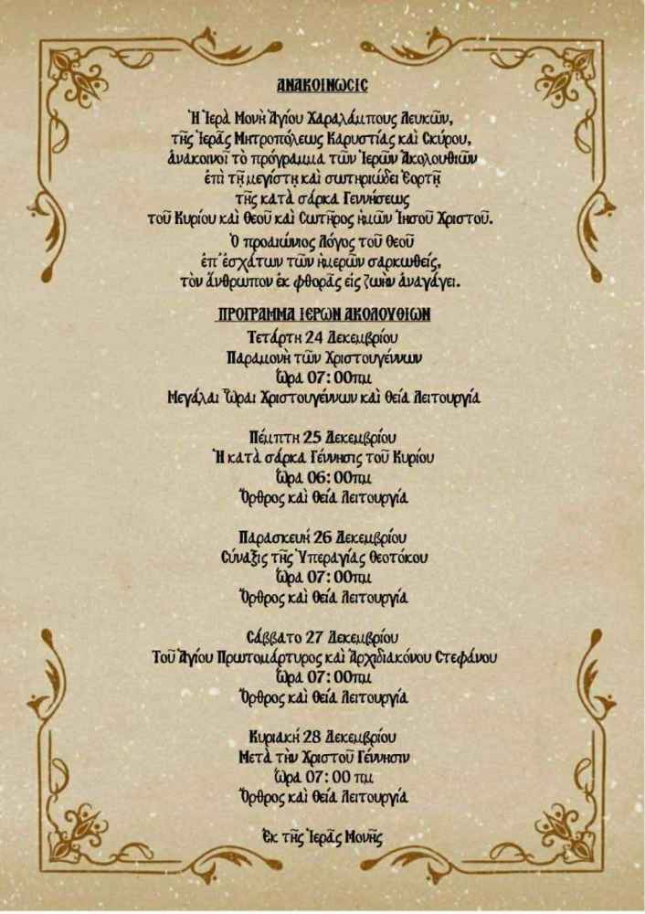 Ανακοίνωση προγράμματος Ιερών Ακολουθιών για τα Χριστούγεννα στη Μονή Αγίου Χαραλάμπους Λευκών!