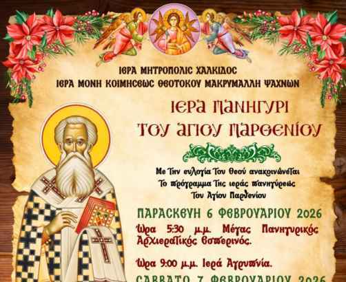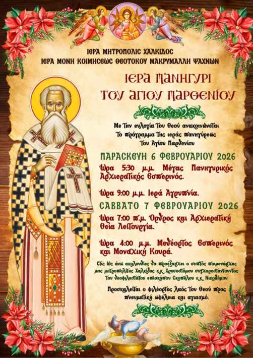 >>> Ι.Μ. Χαλκίδας: Διήμερος εορτασμός του Αγίου Παρθενίου στην Ιερά Μονή Μακρυμάλλη– Το πρόγραμμα των ακολουθιών!