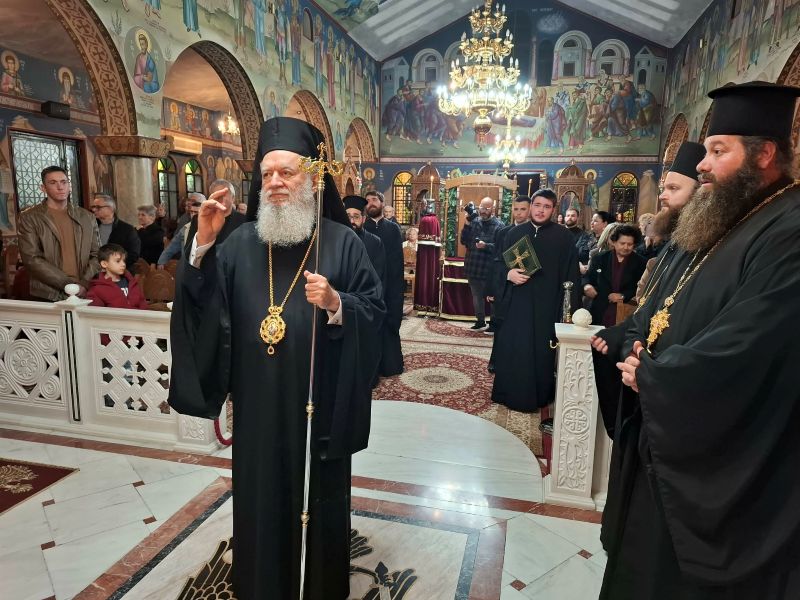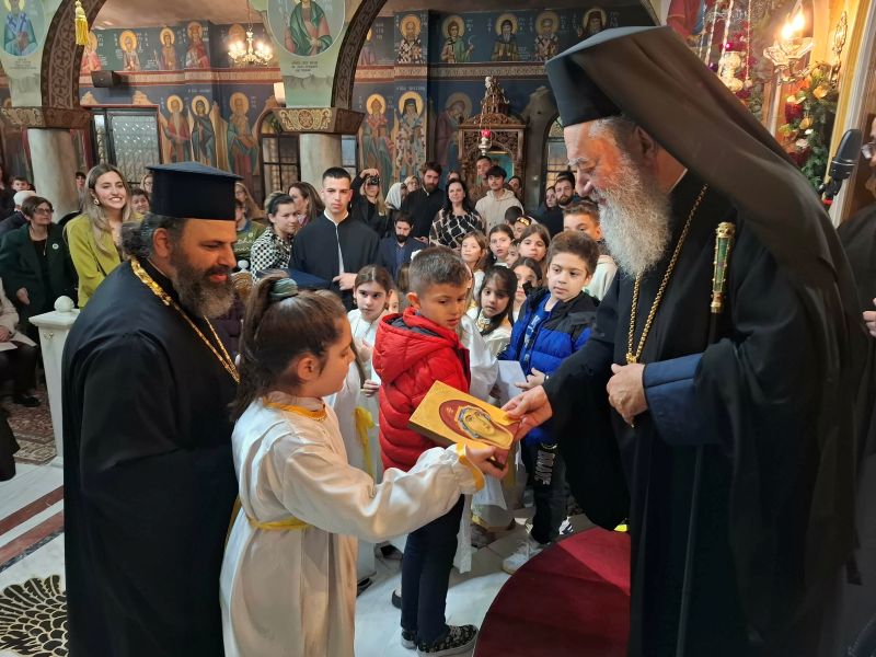 Προ της λιτανείας, τα παιδιά των κατηχητικών της Ενορία με την καθοδήγηση του δραστήριου εφημέριου, πρωτοπρεσβ. Ιωάννου Γκρινιάρη και των συνεργατών του κατηχητών απέδωσαν το τροπάριο του αγίου, της Εορτής των Χριστουγέννων, αλλά και παραδοσιακά κάλαντα της Πατρίδος μας. Τέλος, τα παιδιά προσέφεραν στον Σεβασμιώτατο μια εικόνα της Παναγίας αγιογραφημένη από το εργαστήρι αγιογραφίας της Ενορίας.