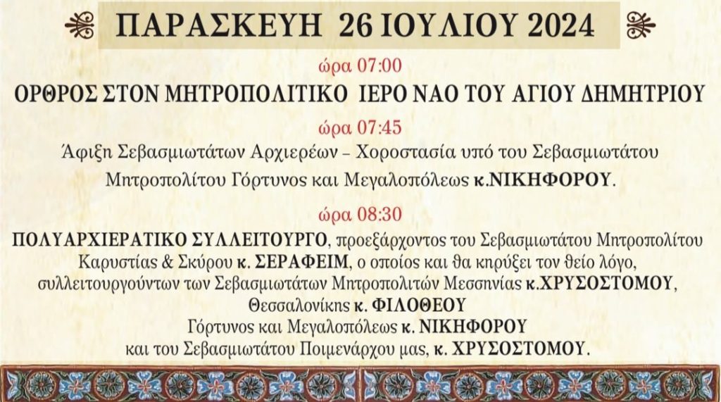 ώρα 07:00 Όρθρος στον Ιερό Μητροπολιτικό Ναό του Αγίου Δημητρίου,