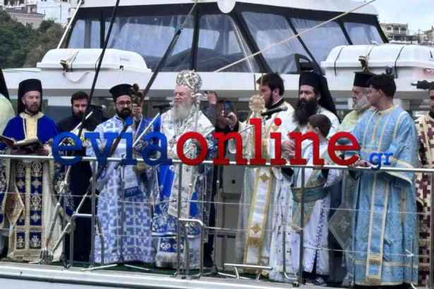 Με μεγαλοπρέπεια τελέστηκε ο αγιασμός των υδάτων στην Χαλκίδα, πάνω στο καϊκι από τον Σεβασμιώτατο Ποιμενάρχη μας, Μητροπολίτη Χαλκίδας κ. Χρυσόστομο. Πλήθος Κολυμβητών έπεσαν στην θάλασσα για να πιάσουν τον Σταυρό. Τελικά ένας 18χρονος Χαλκιδέος ο Χατζηγεωργίου Μιχαήλ ήταν αυτός που ανέβηκε στο καίκι με τον Σταυρό στο χέρι και πήρε την ευλογία από τον Μητροπολίτη μας.