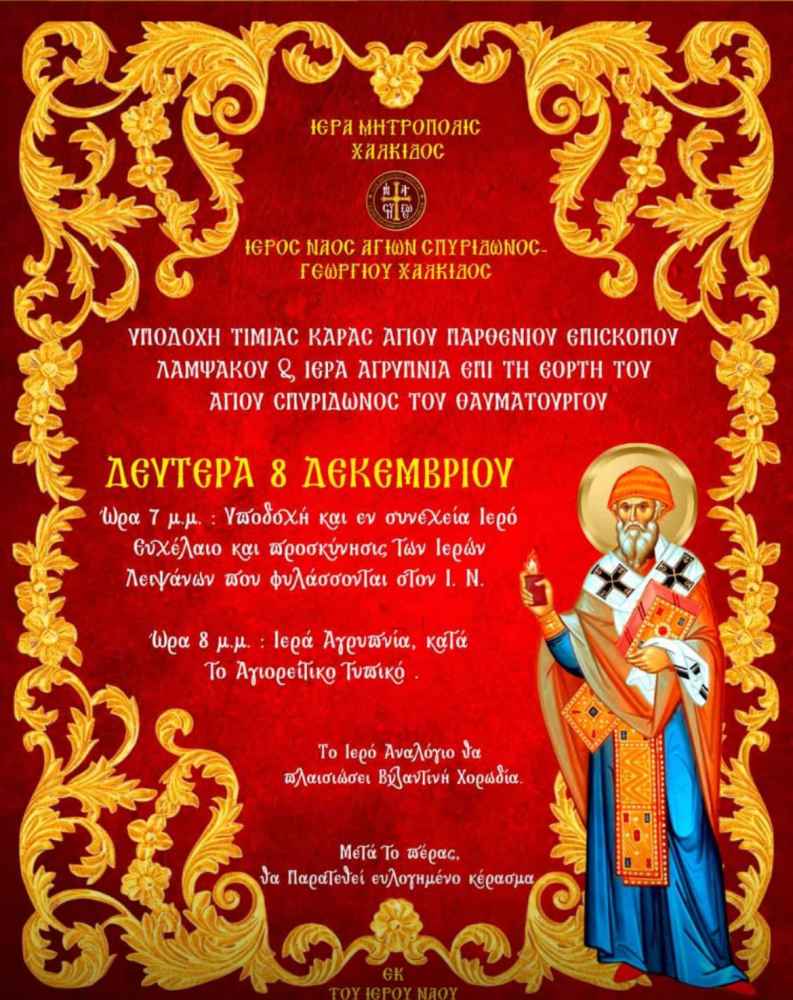 Τη Δευτέρα 8 Δεκεμβρίου 2025, στις 7:00 το απόγευμα, ο Ενοριακός Ναός Αγίου Σπυρίδωνος–Γεωργίου στη Χαλκίδα θα φιλοξενήσει ιερά αγρυπνία, ενόψει της τιμής προς τον προστάτη Άγιο της ενορίας.