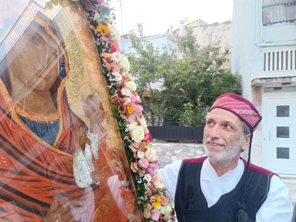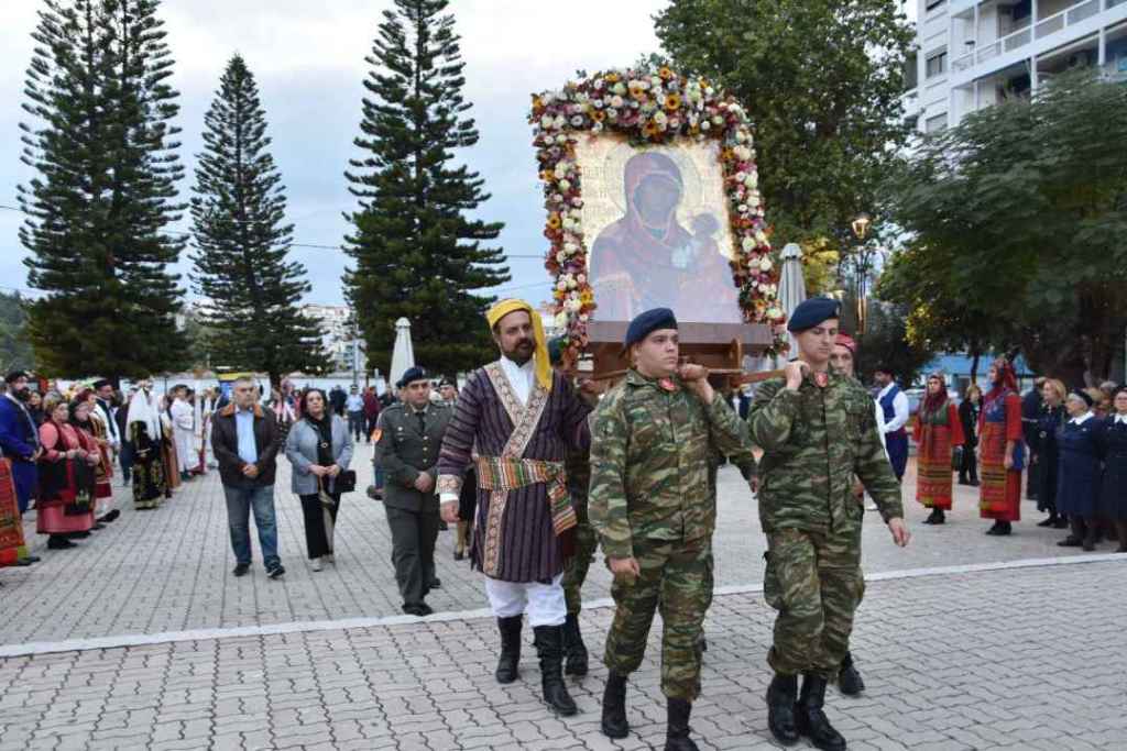 Ιδιαίτερη στιγμή της εκδήλωσης αποτέλεσε η λιτανεία της Ιεράς Εικόνας της Παναγίας, η οποία μεταφέρθηκε πάνω σε στρατιωτικό όχημα, από τον Ιερό Ναό Τιμίου Προδρόμου έως την πλατεία Αγίου Νικολάου, συνοδεία πλήθους πιστών και μελών εκκλησιαστικών και πολιτιστικών φορέων.