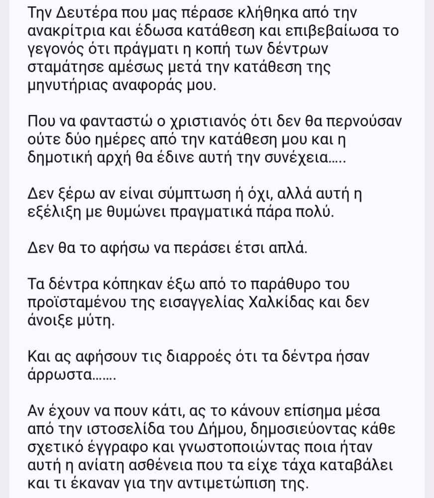 Ωστόσο, δύο μόλις ημέρες αργότερα, σύμφωνα με τον ίδιο, η δημοτική αρχή προχώρησε σε νέα κοπή δέντρων, αυτή τη φορά έξω από το παράθυρο του προϊσταμένου της εισαγγελίας Χαλκίδας. «Δεν ξέρω αν είναι σύμπτωση ή όχι, αλλά αυτή η εξέλιξη με θυμώνει πραγματικά πάρα πολύ. Δεν θα το αφήσω να περάσει έτσι απλά», σημειώνει.
