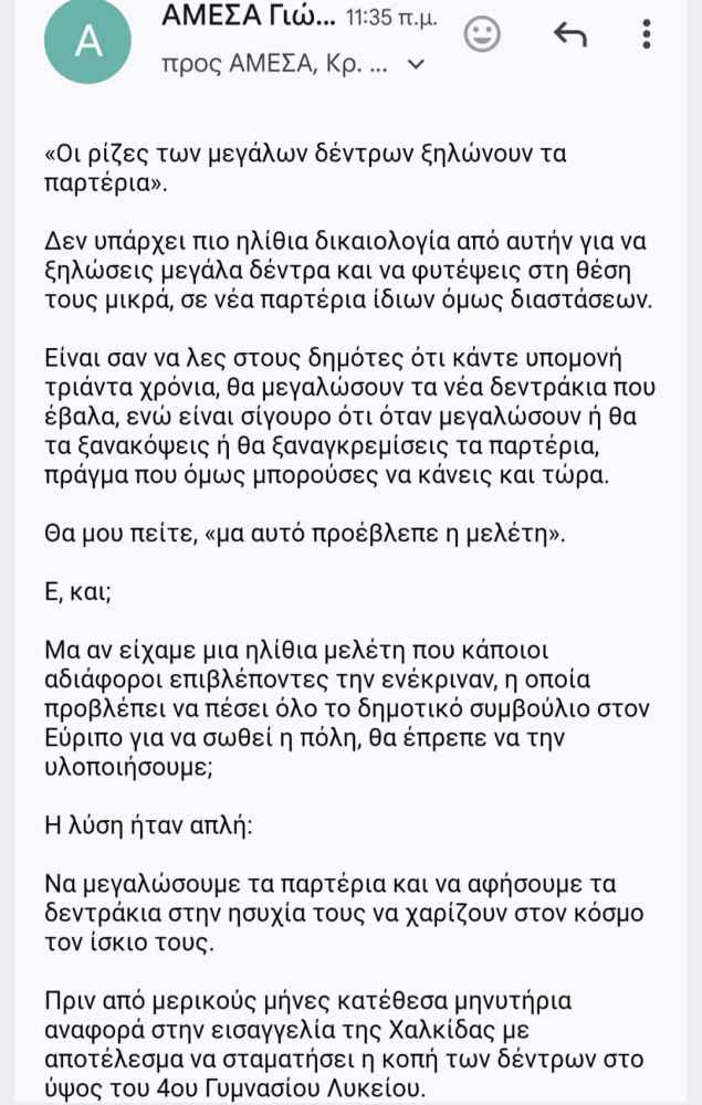 Κλείνοντας, υπογραμμίζει πως η λύση ήταν απλή: η διεύρυνση των παρτεριών ώστε τα δέντρα να παραμείνουν «στην ησυχία τους να χαρίζουν τον ίσκιο τους», αντί της μαζικής κοπής.