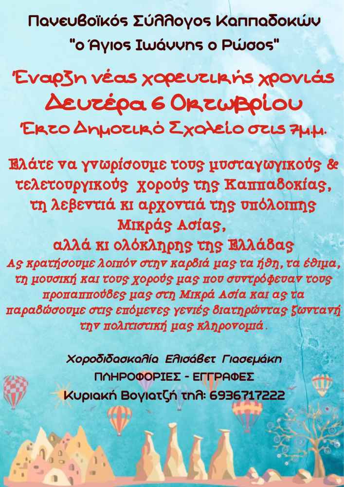 Το Διοικητικό Συμβούλιο του Πανευβοϊκού Συλλόγου Καππαδοκών «Ο Άγιος Ιωάννης ο Ρώσος» και η χοροδιδάσκαλος Ελισάβετ Γιασεμάκη καλωσορίζουν τα μέλη και τους φίλους του συλλόγου στη νέα ακαδημαϊκή και χορευτική χρονιά 2025-2026.