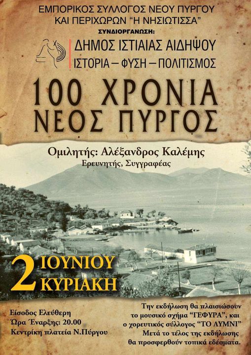 O Εμπορικός Σύλλογος Νέου Πύργου και περιχώρων “Η Νησιώτισσα” συνδιοργανώνουν με τον Δήμο Ιστιαίας -Αιδηψού ομιλία με θέμα “100 χρόνια Νέος Πύργος” την Κυριακή 2 Ιουνίου και ώρα 8 το βράδυ στην κεντρική πλατεία Ν. Πύργου.