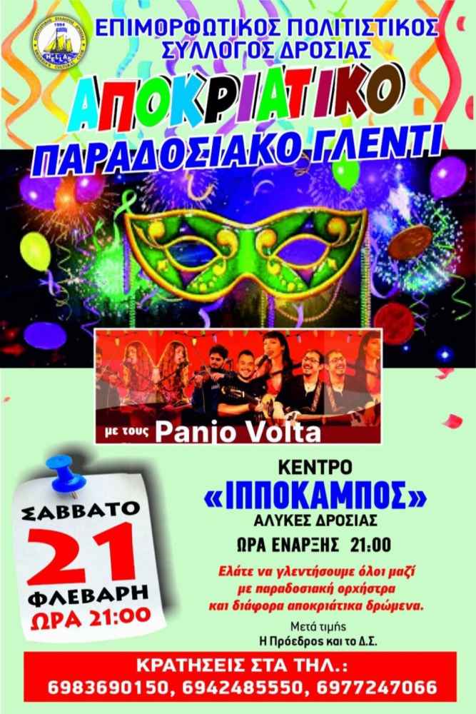 Ο Επιμορφωτικός Πολιτιστικός Σύλλογος Δροσιάς διοργανώνει παραδοσιακό αποκριάτικο γλέντι, προσκαλώντας κατοίκους και επισκέπτες σε μια βραδιά γεμάτη μουσική, χορό και γιορτινή διάθεση.