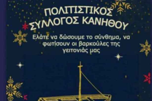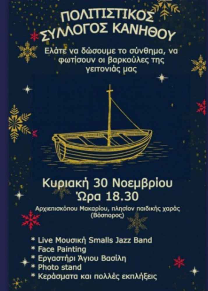 Εορταστική ατμόσφαιρα θα δώσει στην περιοχή της Κανήθου ο Εκπολιτιστικός Σύλλογος Κανήθου, ο οποίος θα φωτίσει βαρκούλες στη λεωφόρο Μακαρίου, δίπλα στην παιδική χαρά (Βόσπορος).