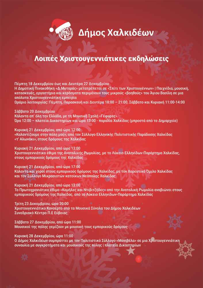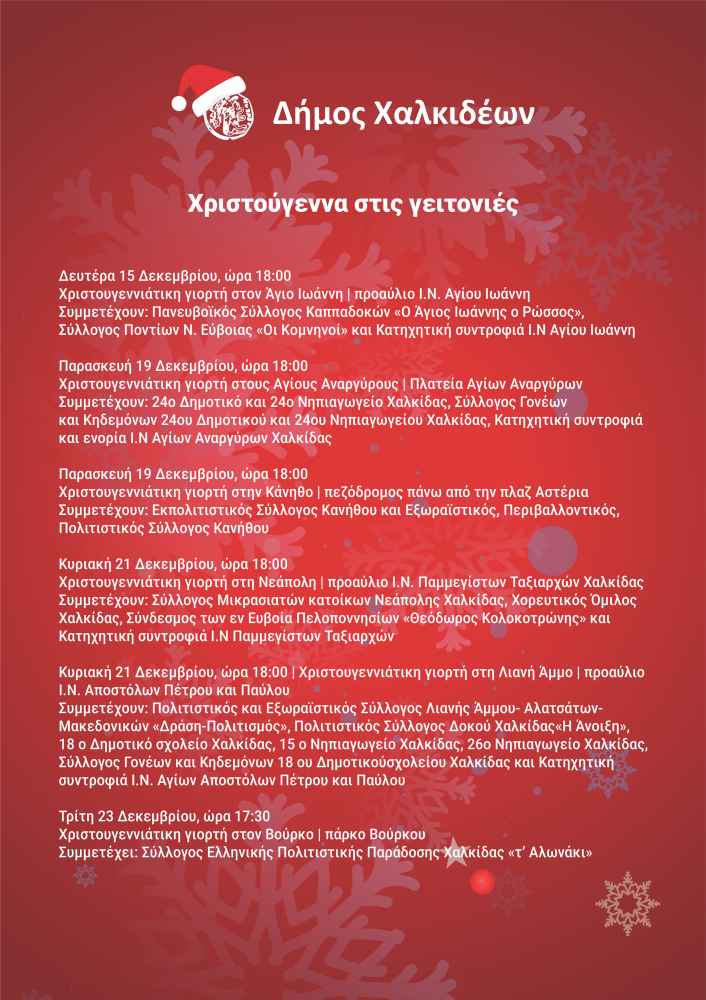 Κυριακή 21 Δεκεμβρίου, ώρα 18:00 | Χριστουγεννιάτικη γιορτή στη Νεάπολη | προαύλιο Ι.Ν. Παμμεγίστων Ταξιαρχών Χαλκίδας – Συμμετέχουν: Σύλλογος Μικρασιατών κατοίκων Νεάπολης Χαλκίδας, Χορευτικός Όμιλος Χαλκίδας, Σύνδεσμος των εν Ευβοία Πελοποννησίων «Θεόδωρος Κολοκοτρώνης» και Κατηχητική συντροφιά Ι.Ν. Παμμεγίστων Ταξιαρχών