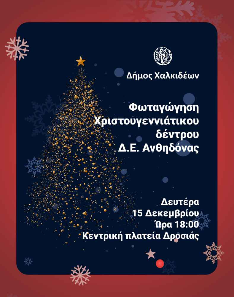 Δευτέρα 15 Δεκεμβρίου | Ώρα 18:00 | Φωταγώγηση Χριστουγεννιάτικου δέντρου Δ.Ε Ανθηδόνας – κεντρική πλατεία Δροσιάς