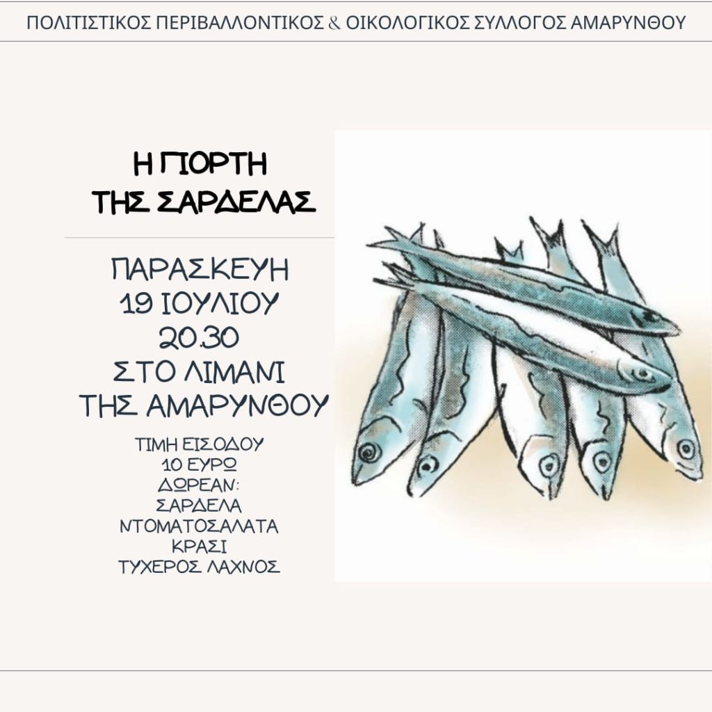 Απόψε θα πραγματοποιηθεί η γιορτή της Σαρδέλας στο λιμάνι της Αμαρύνθου και ώρα 8.30, με την συμμετοχή μουσικού συγκροτήματος, που διοργανώνει ο Πολιτιστικός Σύλλογος Αμαρύνθου στο πλαίσιο των Πολιτιστικών του εκδηλώσεων με την ονομασία «Αμαρύνθια 2024»