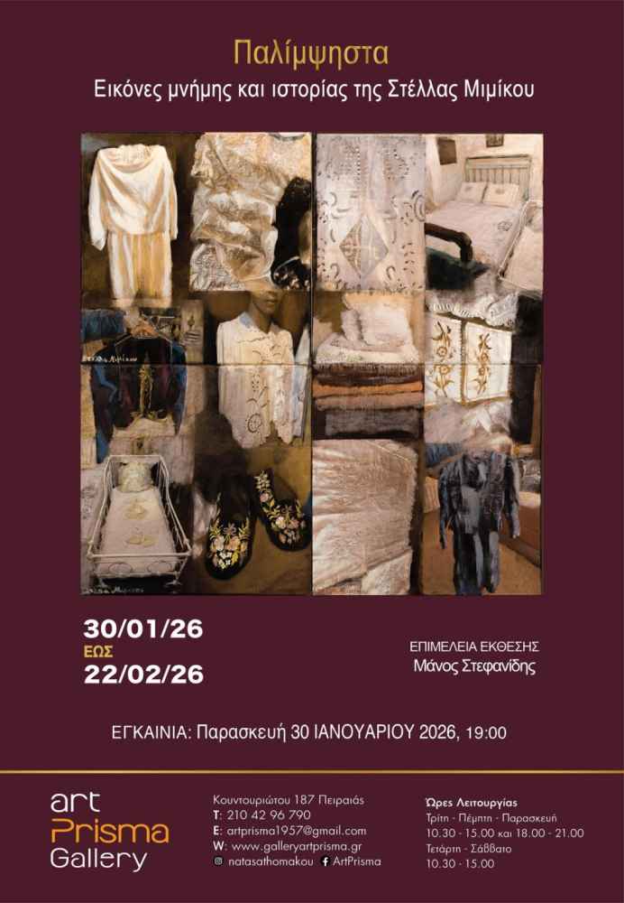Η εικαστικός και ακτιβίστρια Στέλλα Μιμίκου παρουσιάζει στη Gallery Art Prisma την ατομική της έκθεση με τίτλο «ΠΑΛΙΜΨΗΣΤΑ – Εικόνες μνήμης και ιστορίας». Η έκθεση ανοίγει τις πύλες της Παρασκευή 30 Ιανουαρίου 2026, στις 19:00, και θα διαρκέσει μέχρι τις 22 Φεβρουαρίου.