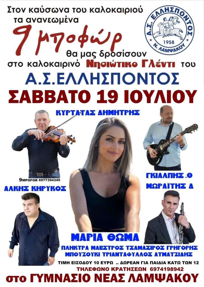 Ο Αθλητικός Σύλλογος ΕΛΛΗΣΠΟΝΤΟΣ Νέας Λαμψάκου προσκαλεί μικρούς και μεγάλους στο καθιερωμένο Νησιώτικο Γλέντι 2025, που θα πραγματοποιηθεί το Σάββατο 19 Ιουλίου, στις 21:00, στον προαύλιο χώρο του Γυμνασίου Νέας Λαμψάκου.