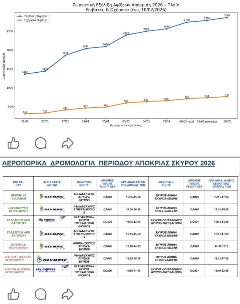 5 (3+2) πτήσεις της Aegean (Olympic Air) από/προς Αθήνα & 2 (1+1) πτήσεις της Sky Express από/προς Θεσσαλονίκη • Επιπλέον, κατόπιν εγγράφου που απεστάλη στην Aegean Airlines και έγινε αποδεκτό, η πτήση της Δευτέρας 24 Φεβρουαρίου τροποποιήθηκε από πρωινή σε μεσημεριανή με αναχώρηση από Σκύρο στις 14:30 Η από Σκύρο πρωινή πτήση είχε προστεθεί με πρωτοβουλία της αεροπορικής εταιρείας, και η αλλαγή ώρας εξυπηρετεί καλύτερα όσους επιλέγουν να μην αποχωρήσουν νωρίς την Καθαρά Δευτέρα.