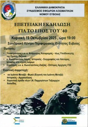 Ο Σύνδεσμος Εφέδρων Αξιωματικών Νομού Ευβοίας (ΣΕΑΝ) διοργανώνει επετειακή εκδήλωση τιμής και μνήμης για το Έπος του 1940, την Κυριακή 19 Οκτωβρίου, στις 7:00 το απόγευμα, στο Συνεδριακό Κέντρο της Περιφερειακής Ενότητας Εύβοιας, στη Χαλκίδα (Λεωφόρος Χαϊνά).