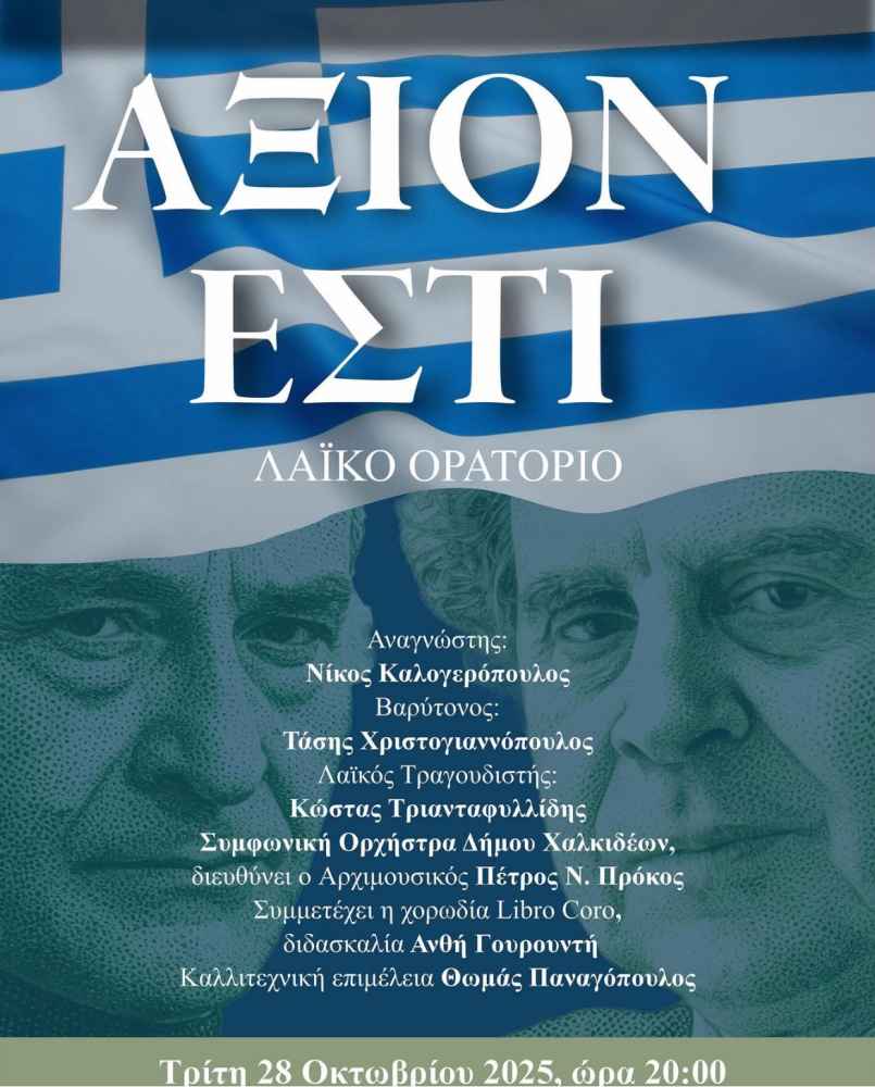 Ο Δήμος Χαλκιδέων, στο πλαίσιο των ΛΓ’ Δημητρίων του Μητροπολιτικού Ιερού Ναού Αγίου Δημητρίου Χαλκίδος και τιμώντας την Εθνική Επέτειο της 28ης Οκτωβρίου 1940, παρουσιάζει το εμβληματικό έργο του ελληνικού πολιτισμού «Άξιον Εστί», σε ποίηση Οδυσσέα Ελύτη και μουσική Μίκη Θεοδωράκη.