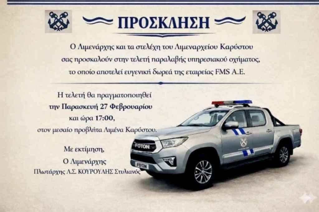Αυτή την φορά σύμφωνα με αποκλειστικές πληροφορίες του evia online η εταιρεία FMS του κ. Ευάγγελου Αλεξανδρή -με την μέριμνα του Λιμενάρχη Καρύστου Πλωτάρχη Λ.Σ. Στυλιανού Κουρουλή- θα παραδώσει ένα σύγχρονο υπηρεσιακό όχημα, που θα ενισχύσει τις δυνατότητες του λιμεναρχείου ακόμα περισσότερο.
