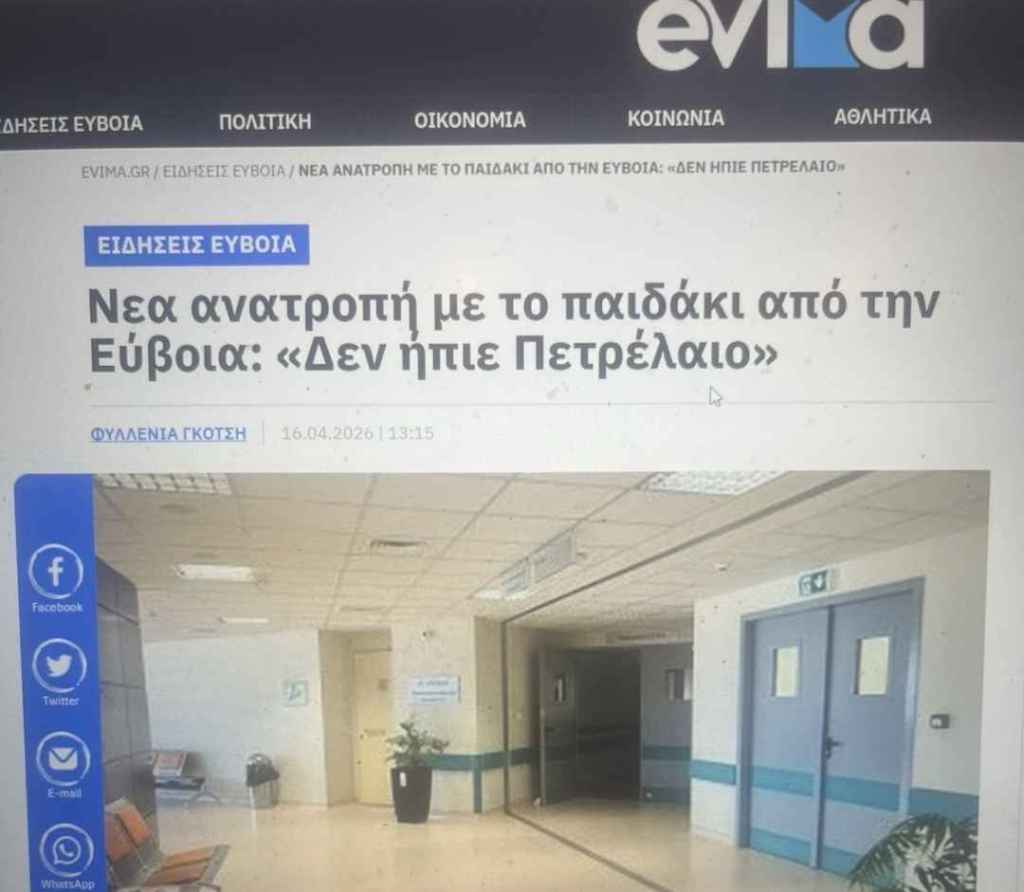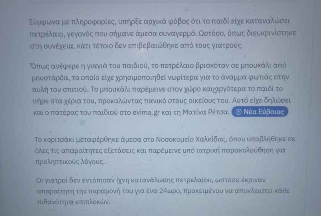 Συνεχίζει να εξευτελίζει την δημοσιογραφία και να παραπληροφορεί η Ματίνα Ρέτσα που γράφει σήμερα ότι υπάρχει νέα εξέλιξη για το βρέφος 1,5 έτους που βγήκε από το Νοσοκομείο Χαλκίδας σήμερα και το οποίο είχε πιει πετρέλαιο το οποίο έβγαλαν οι γιατροί στο Κ.Υ. Αλιβερίου.