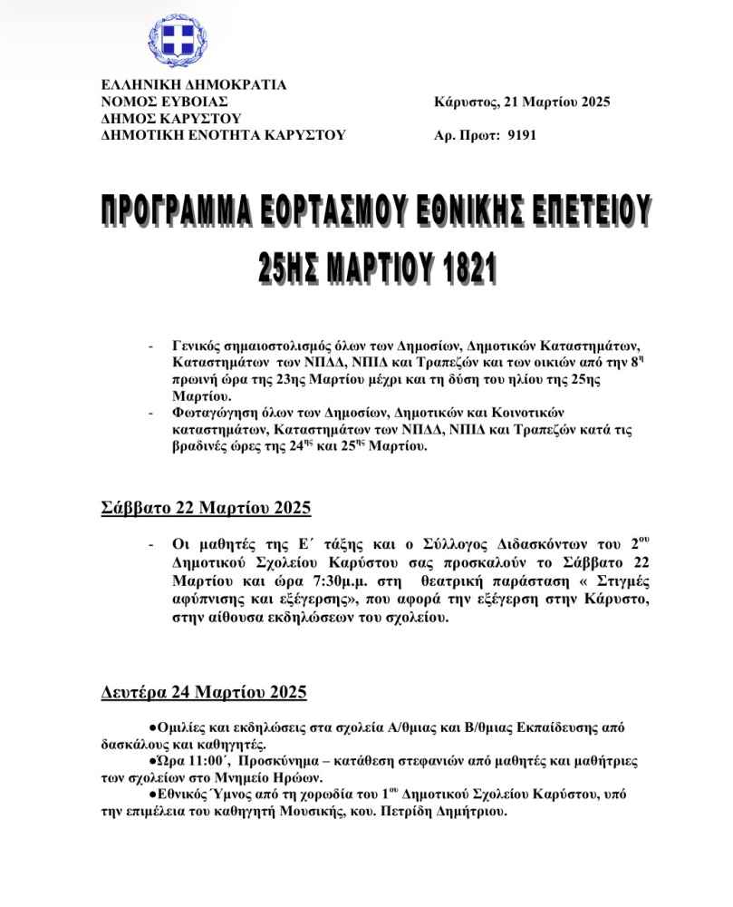 >>> Δήμος Καρύστου: Το πρόγραμμα των εκδηλώσεων για τον εορτασμό της Εθνικής Επετείου της 25ης Μαρτίου σε όλες τις δημοτικές ενότητες