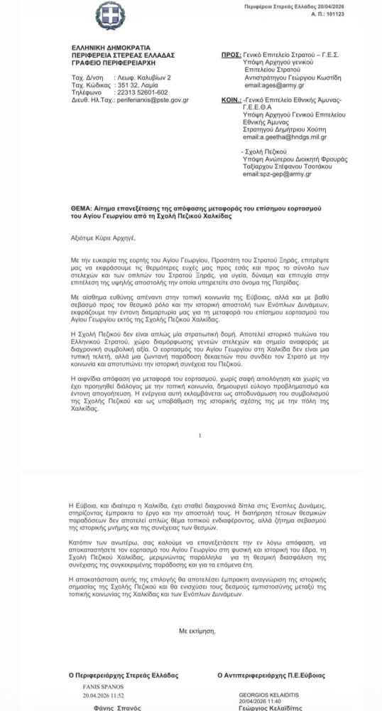 Η Περιφέρεια Στερεάς Ελλάδας εκφράζει την έντονη αντίθεσή της στην απόφαση του Γενικού Επιτελείου Στρατού να μεταφέρει τον επίσημο εορτασμό του Αγίου Γεωργίου εκτός της Σχολής Πεζικού στη Χαλκίδα. Με κοινή επιστολή τους προς τον Αρχηγό ΓΕΣ, Αντιστράτηγο Γεώργιο Κωστίδη, ο Περιφερειάρχης Φάνης Σπανός και ο Αντιπεριφερειάρχης Εύβοιας Γιώργος Κελαϊδίτης ζητούν την άμεση επανεξέταση της κίνησης αυτής.