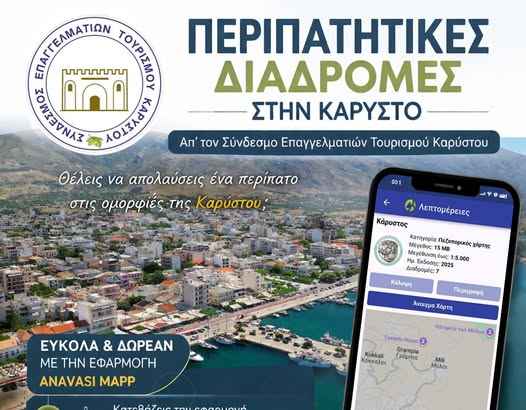Με τη χρήση της δωρεάν εφαρμογής Anavasi Mapp, οι επισκέπτες μπορούν να κατεβάσουν εύκολα τον χάρτη της περιοχής, να επιλέξουν τη διαδρομή που τους ταιριάζει και να ξεκινήσουν μια οργανωμένη εμπειρία εξερεύνησης στη νότια Εύβοια.